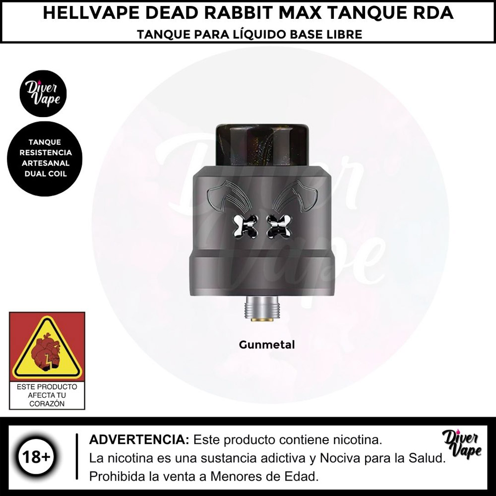 El Hellvape Dead Rabbit Max RDA es un atomizador de dripeo reconstruible (RDA) de gran diámetro (28 mm), diseñado para configuraciones de doble resistencia y enfocado en la producción de grandes nubes de vapor y un sabor intenso. Es conocido por su facilidad de montaje y su compatibilidad con mods squonk.