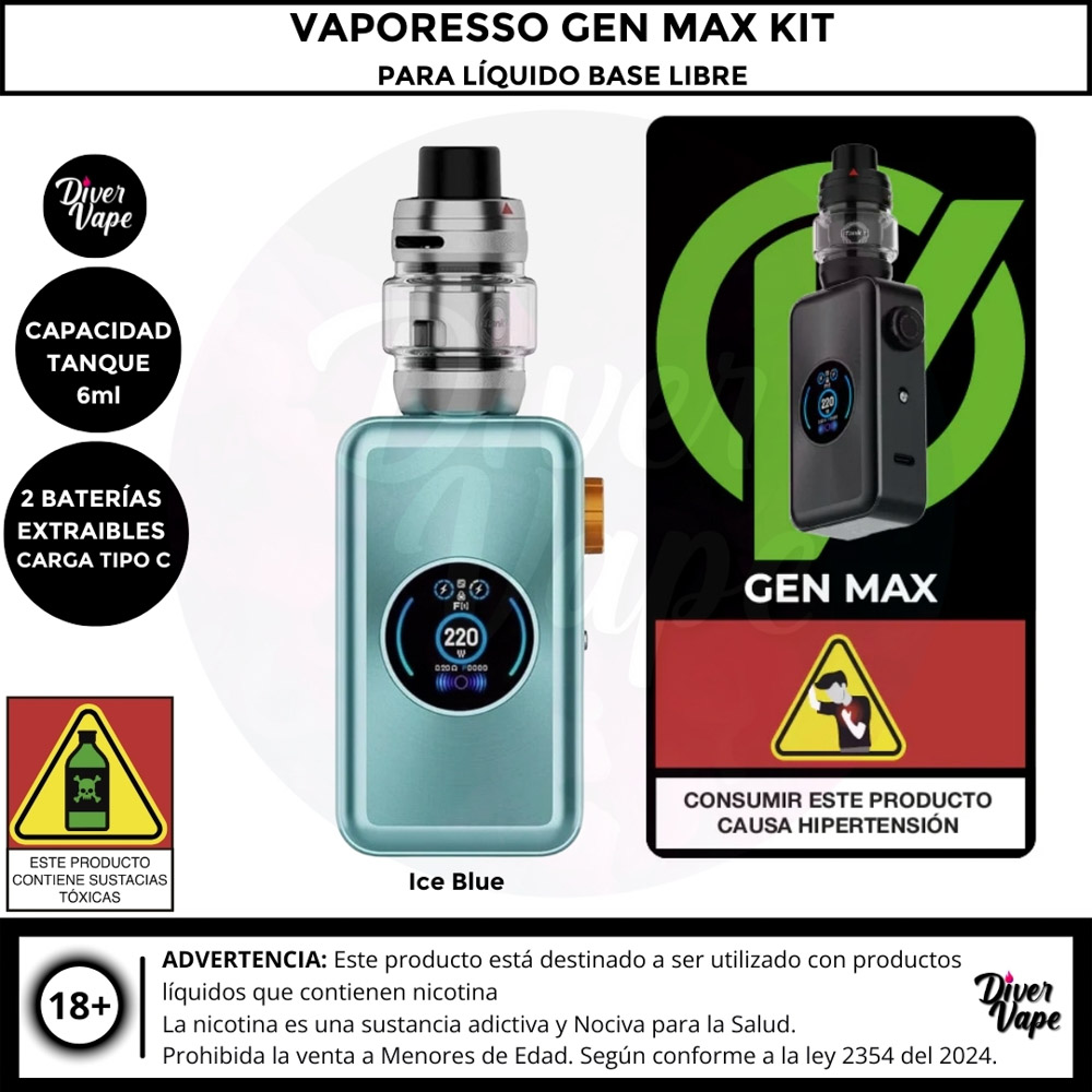 el Kit Vaporesso GEN Max , diseñado para vapeadores que buscan la máxima potencia y versatilidad. Con una capacidad de 6 ml y compatible con el nuevo iTank T, este kit garantiza un vapeo duradero sin necesidad de recargas frecuentes. Las dos baterías 18650 (no incluidas) proporcionan una potencia robusta, con un rango de salida de 5-220 W.
