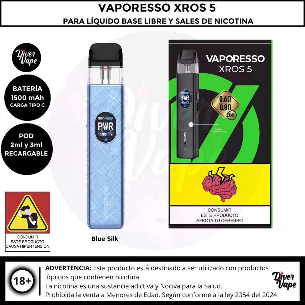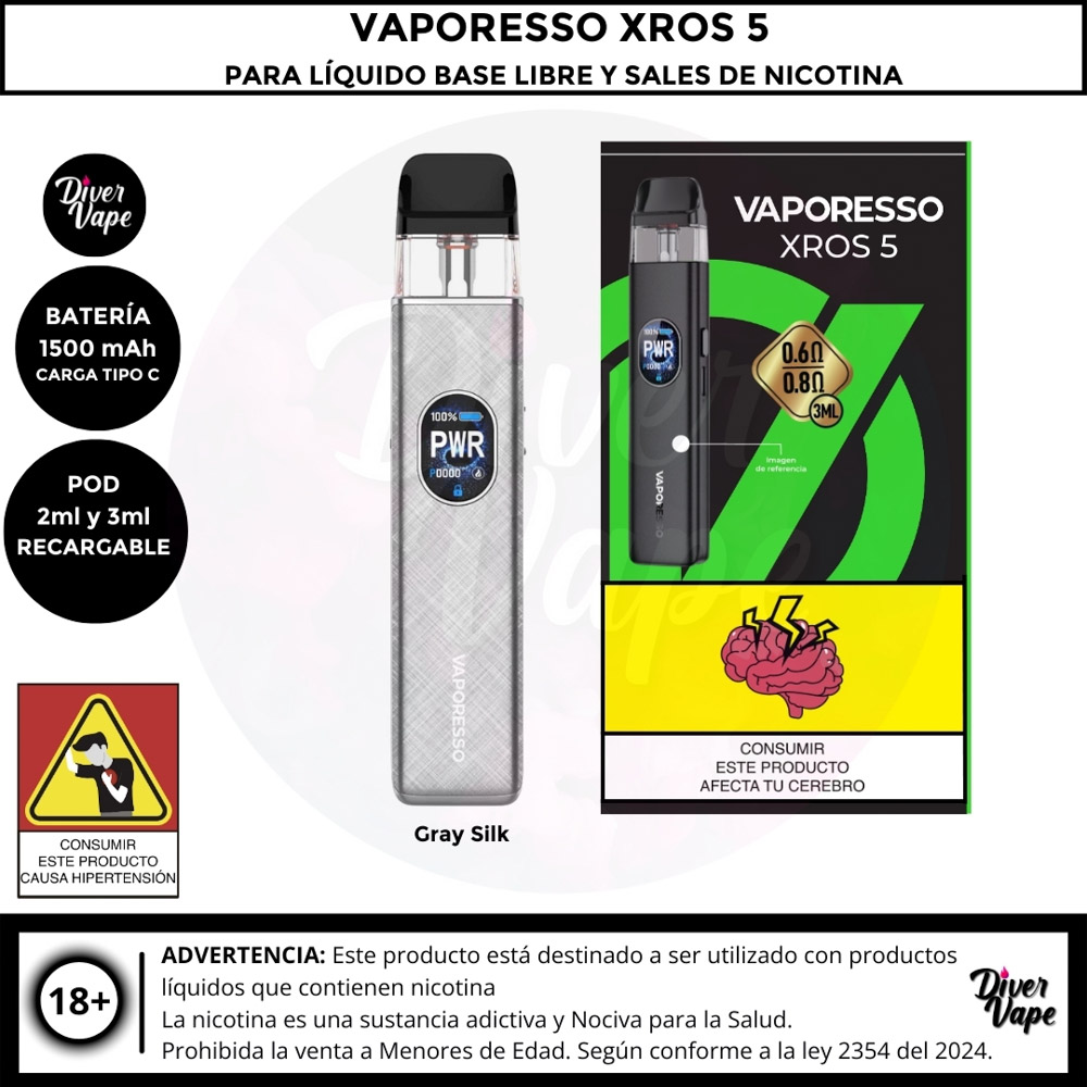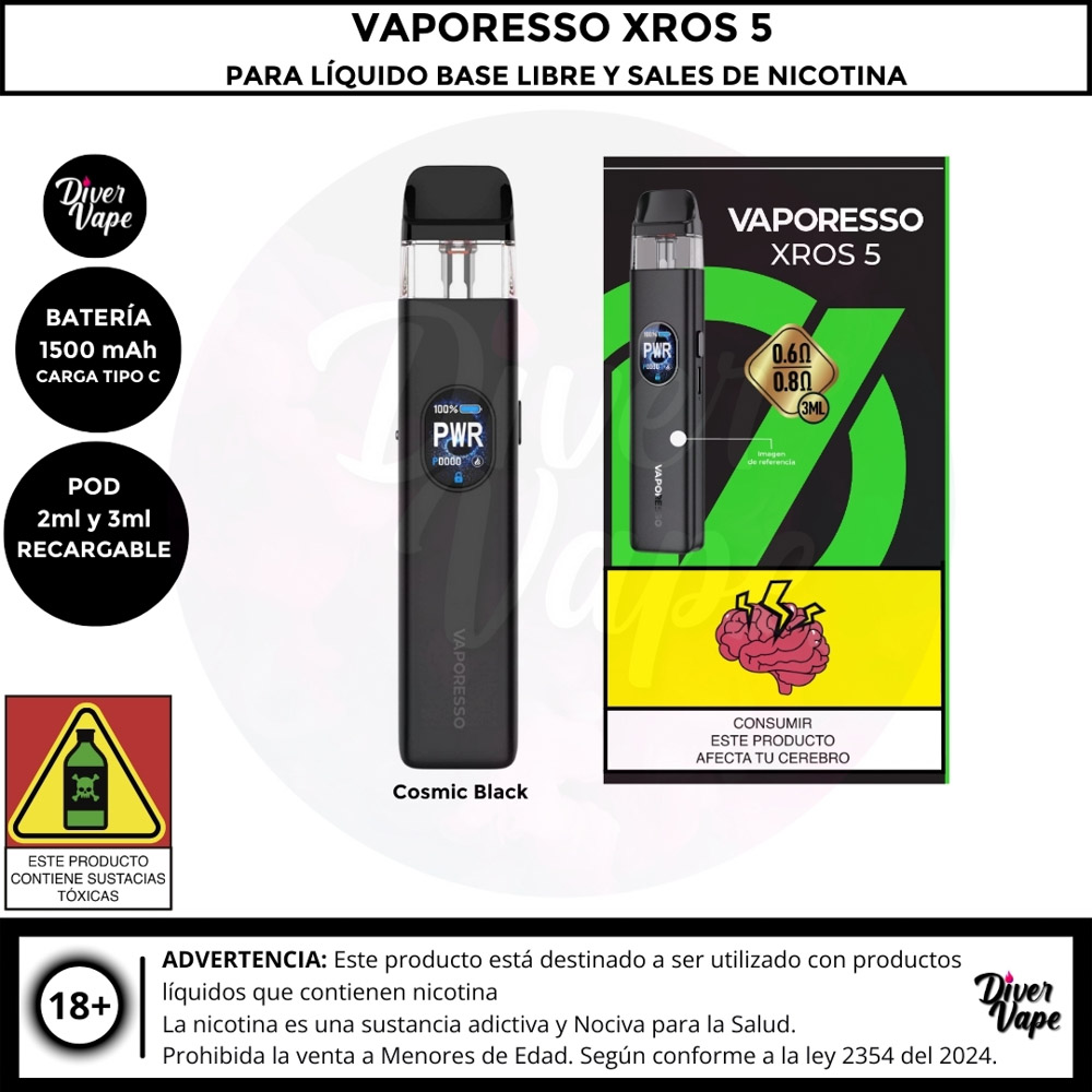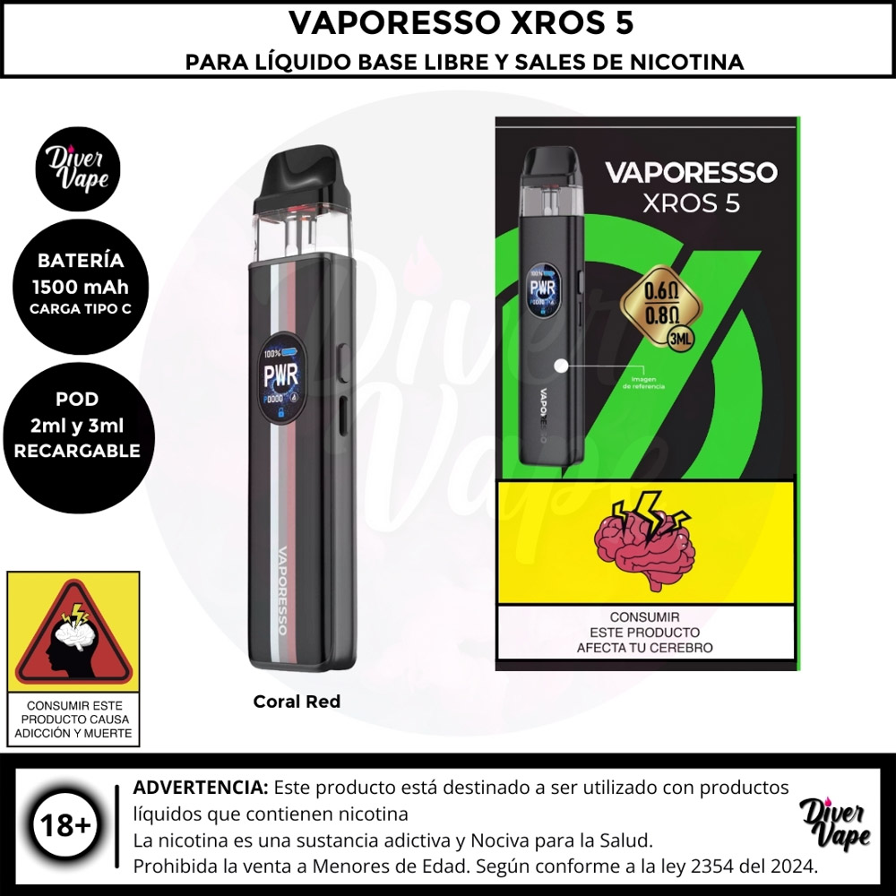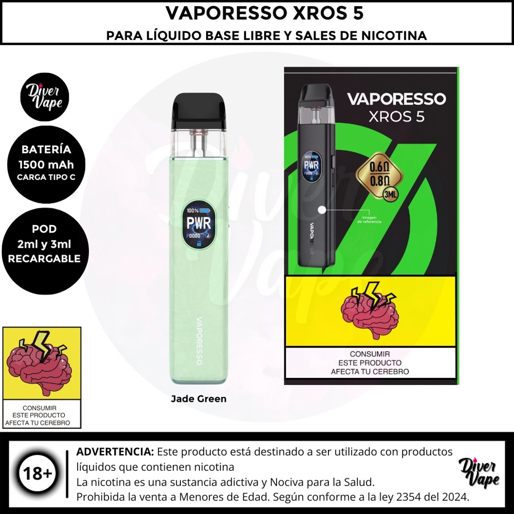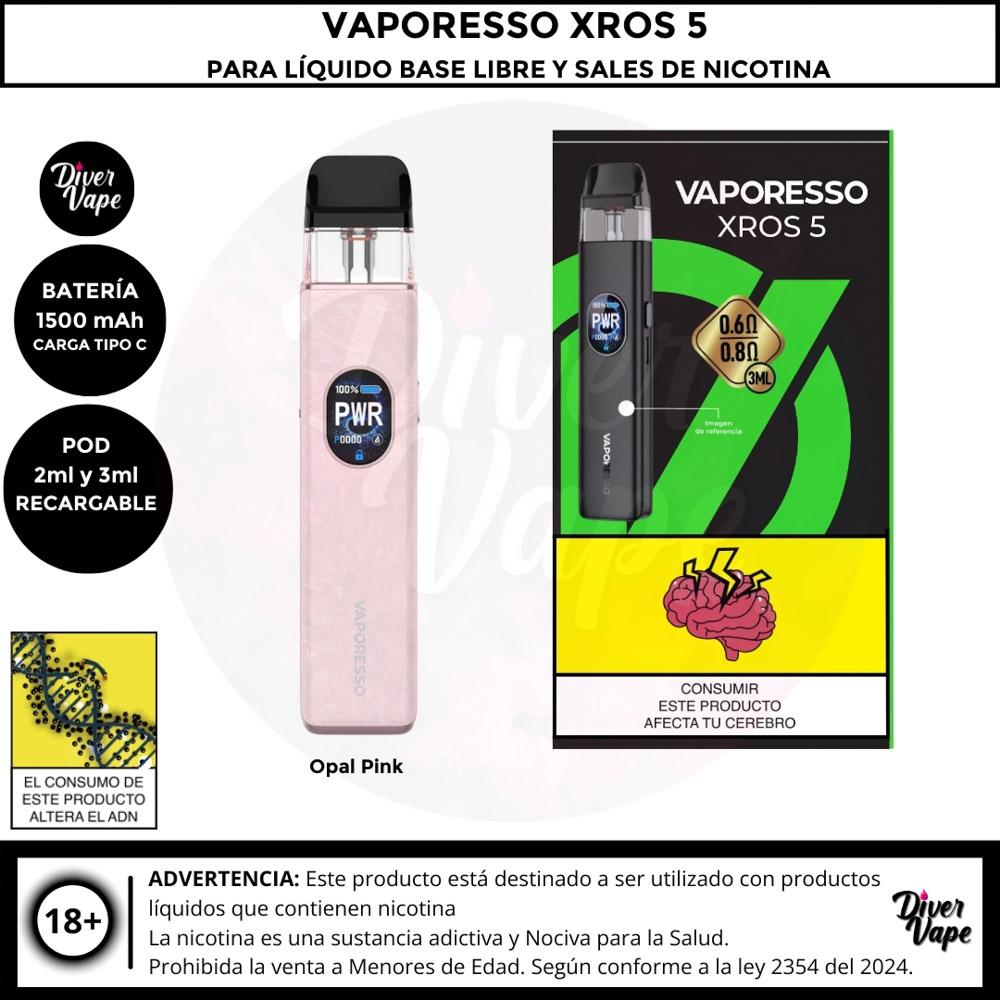 El Vaporesso XROS 5 es el dispositivo definitivo para los entusiastas del vapeo boca a pulmón (MTL) y RDL, con un rendimiento potente y diseño elegante. Cuenta con una batería de 1500 mAh y una potencia máxima de 30W, ofreciendo un uso prolongado y versátil. Gracias a la tecnología COREX 3.0, garantiza un sabor óptimo y es compatible con toda la serie de pods XROS.