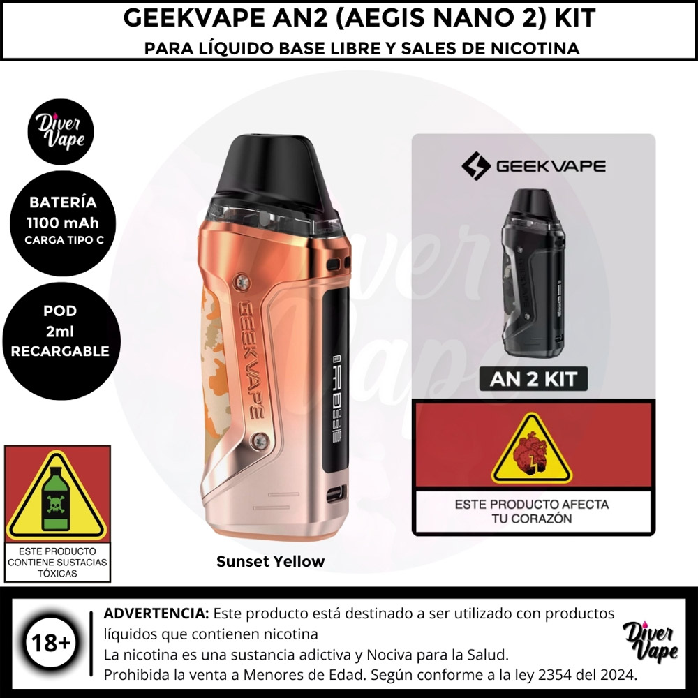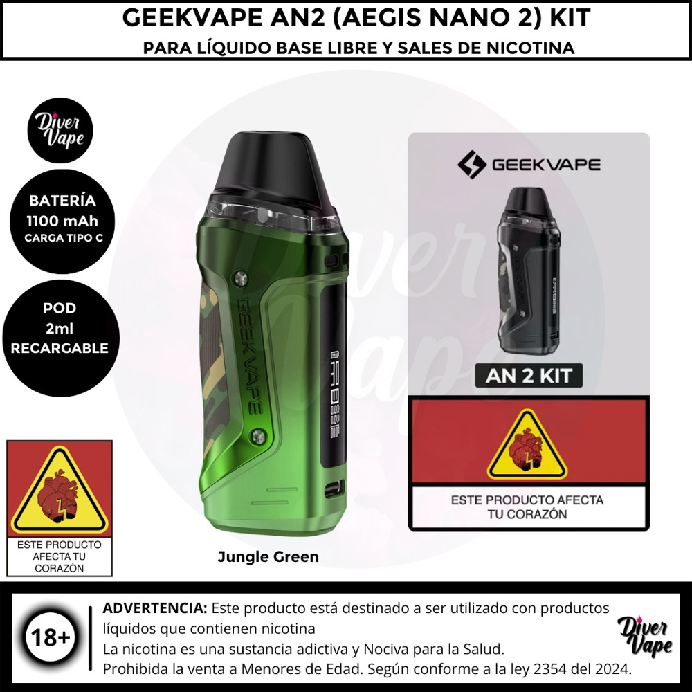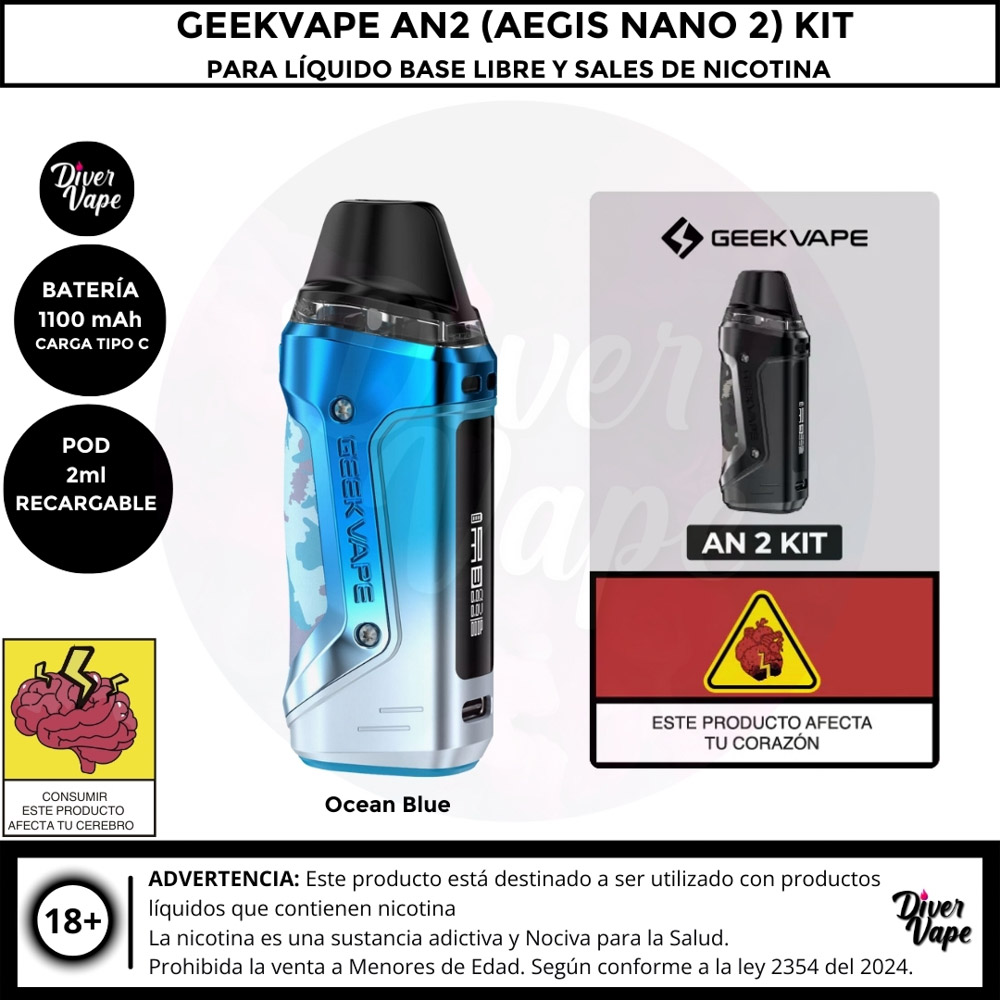 El kit GeekVape AN 2 incluye una gran batería recargable de 1100 mAh que se carga mediante un puerto USB-C. El kit Pod cuenta con un flujo de aire ajustable para que puedas elegir el flujo adecuado según tus preferencias. Utiliza ambos mecanismos de vapeo: inhalación y botón para mayor versatilidad. Tiene una impresionante capacidad de 2 ml. Además, cuenta con una pantalla de 0,69 pulgadas para comprobar el nivel de batería y e-líquido. El kit Pod tiene una resistencia de resistencia de 0,6 ohmios y 1,2 ohmios.