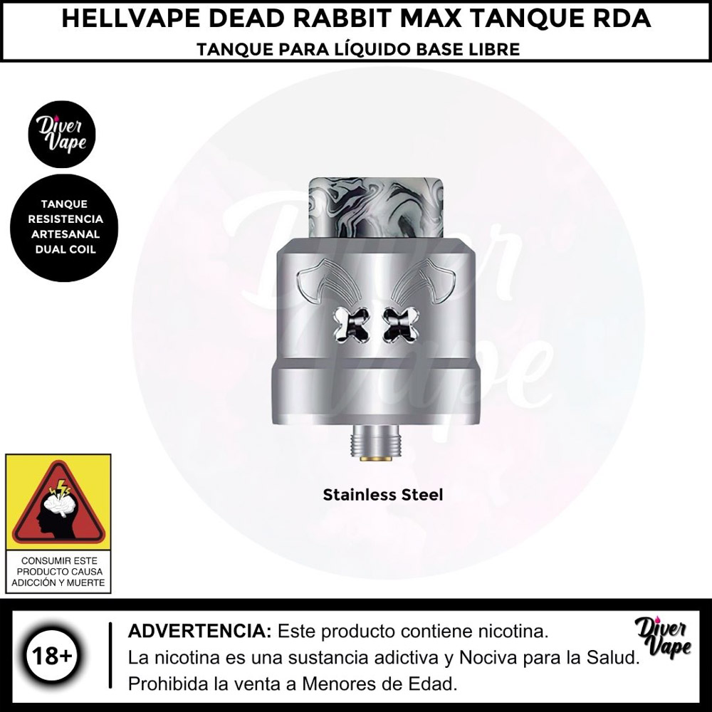 El Hellvape Dead Rabbit Max RDA es un atomizador de dripeo reconstruible (RDA) de gran diámetro (28 mm), diseñado para configuraciones de doble resistencia y enfocado en la producción de grandes nubes de vapor y un sabor intenso. Es conocido por su facilidad de montaje y su compatibilidad con mods squonk.