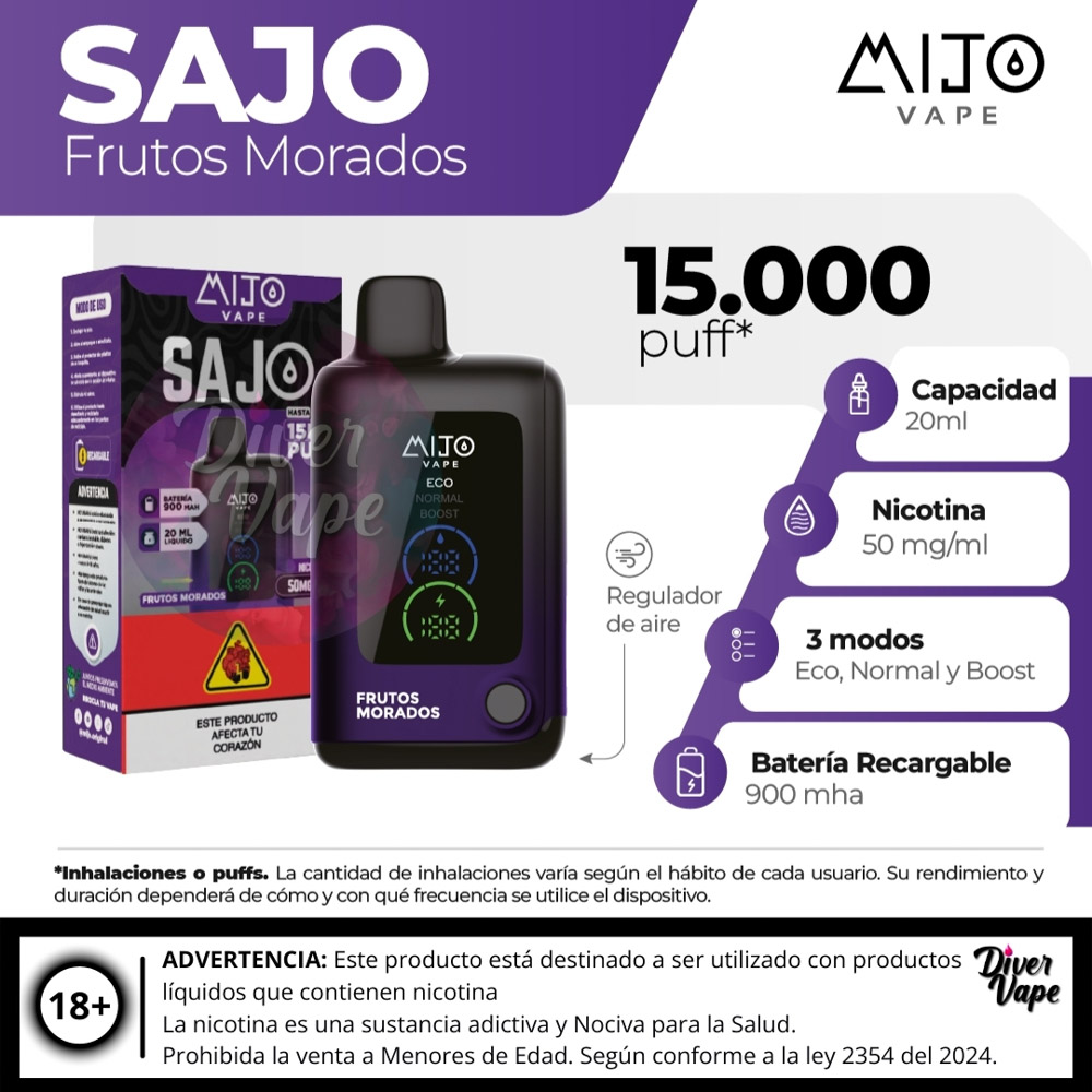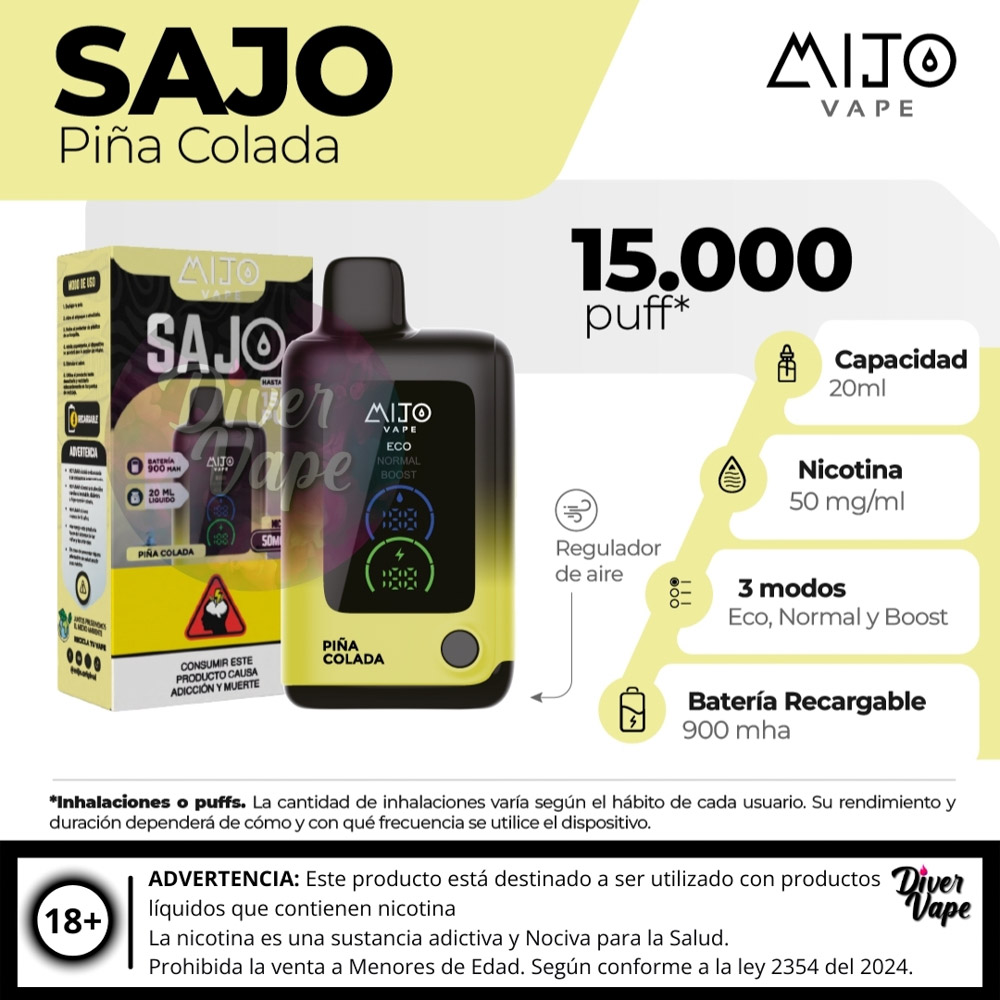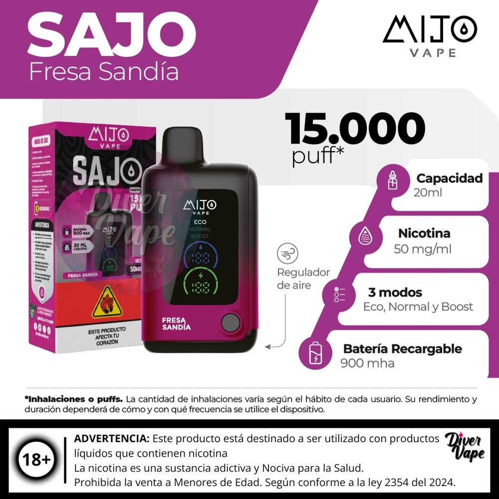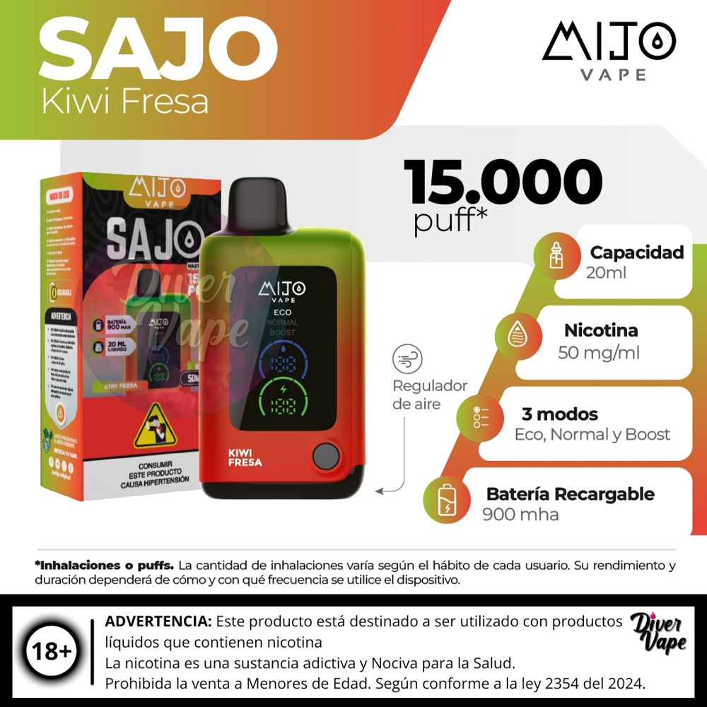 El MIJO VAPE Sajo 15.000 Puff es un dispositivo de vapeo desechable de ultra larga duración, diseñado para ofrecer una experiencia prolongada y de alto rendimiento.