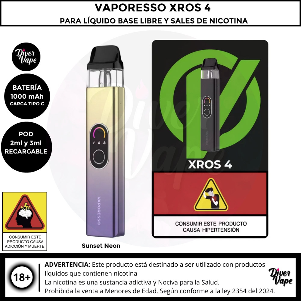 El kit Vaporesso XROS 4 cuenta con una batería de 1000 mAh que se carga mediante una ranura de carga USB-C. El kit XROS 4 de Vaproesso tiene una capacidad de 3 ml y una resistencia de 0,4 Ω. Utiliza tecnología Corex 2.0 que ofrece más sabores y prolonga su vida útil. El kit XROS 4 es compatible con todos los pods de la serie XROS.