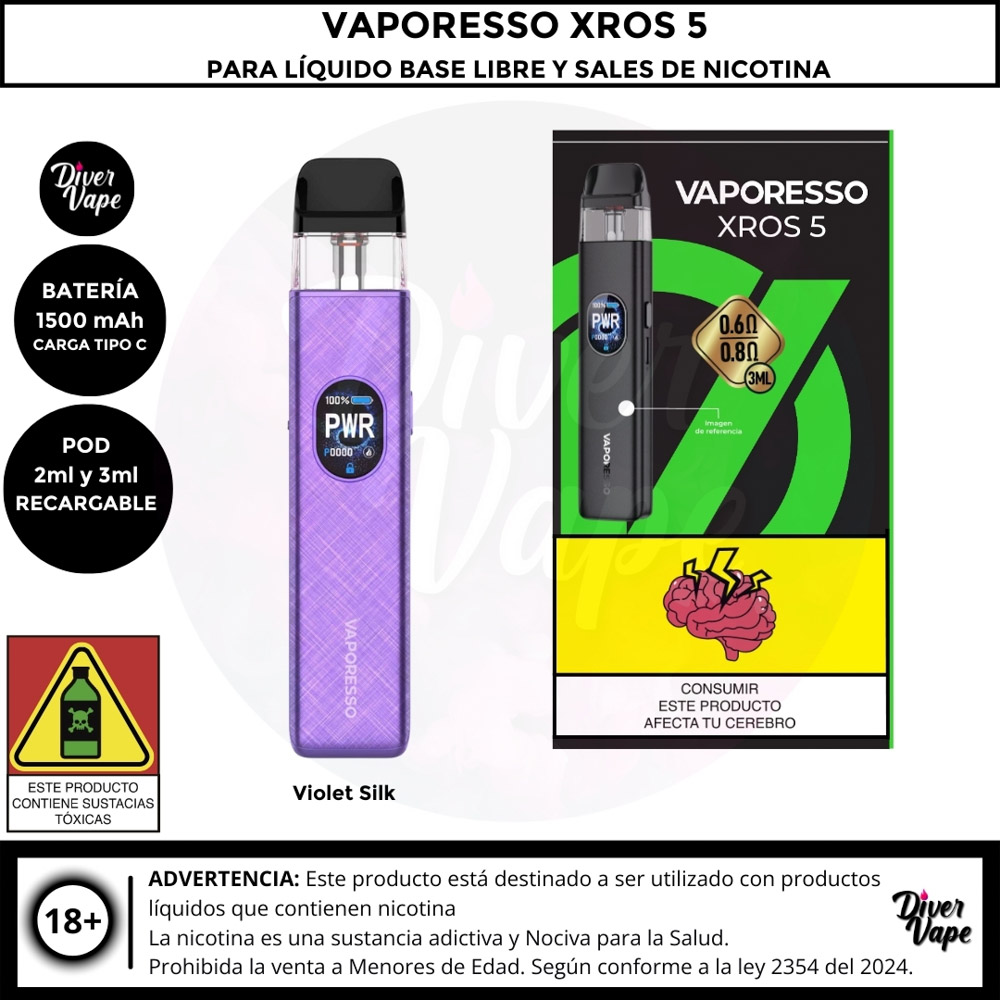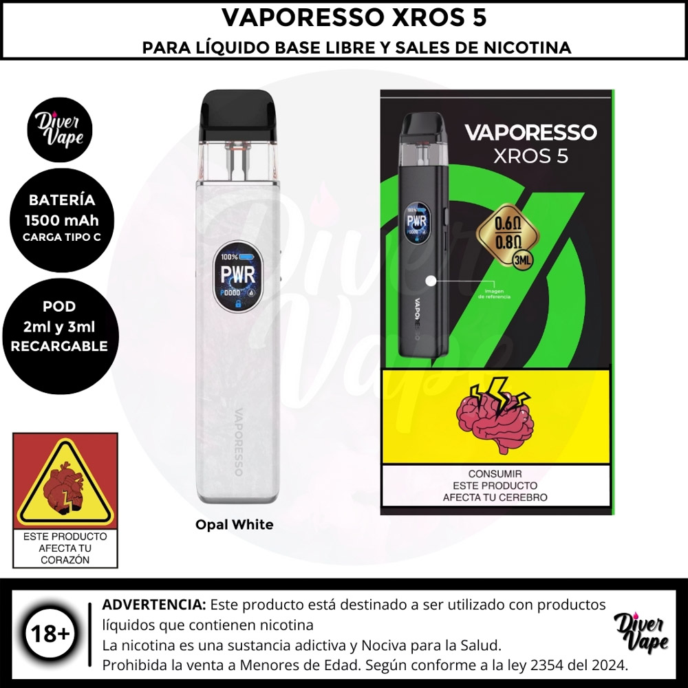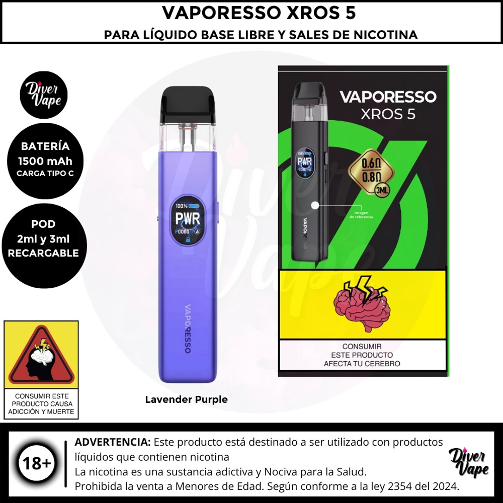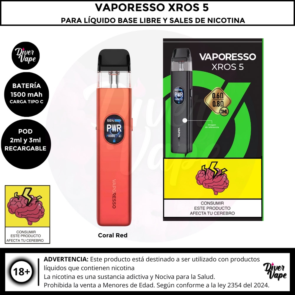 El Vaporesso XROS 5 es el dispositivo definitivo para los entusiastas del vapeo boca a pulmón (MTL) y RDL, con un rendimiento potente y diseño elegante. Cuenta con una batería de 1500 mAh y una potencia máxima de 30W, ofreciendo un uso prolongado y versátil. Gracias a la tecnología COREX 3.0, garantiza un sabor óptimo y es compatible con toda la serie de pods XROS.